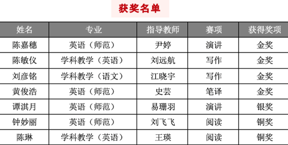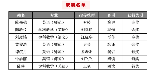 其中,2021级文学与传媒学院学生冯凯晴荣获大学英语组一等奖(指导老师:唐慧玲)、2020级英语(师范)专业学生黄俊浩荣获英语专业组一等奖(指导老师:刘远航),2020级商务英语学生李嘉敏(指导老师:刘飞飞)和2020级英语(师范)专业学生陈嘉怡(指导老师:卢迎如)荣获英语专业组二等奖、2020级计算机学院学生朱梅基(指导老师:关银霞)和2021级电子与信息学院学生肖喆荣获大学英语组三等奖(指导老师:江晓宇)。