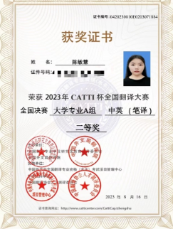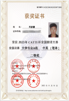 近日,2023年“CATTI杯”全国翻译大赛决赛成绩揭晓,我院学子凭借扎实的语言功底和良好的翻译素养,从众多参赛者中脱颖而出,2021级英语(师范)专业本科生邓家豪、陈敏慧获全国总决赛大学专业A组中英(笔译)二等奖,21级学科教学(英语)专业研究生柴鸥洋、20级商务英语专业郑佳琳、2021级英语(师范)专业本科生彭坚、黄霞获全国总决赛大学专业A组中英(笔译)三等奖。在决赛中,另有Beat365官网其他学院3名学子获奖。Beat365正版唯一官网必一获优秀组织奖。