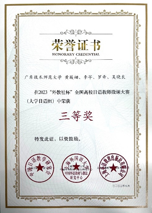 近日,由教育部高等学校外国语言文学类专业教学指导委员会日语分委员会指导、中国日语教学研究会联合中国外语教材与教法研究中心、上海外语教育出版社共同主办的2023“外教社杯”全国高校日语教师微课大赛(大学日语组)评选结果公布,我院日语系团队提交的参赛作品,在全国150余所高校的180个参赛作品中脱颖而出,得到三等奖的好成绩,是Beat365官网外语课程建设的又一教学成果。