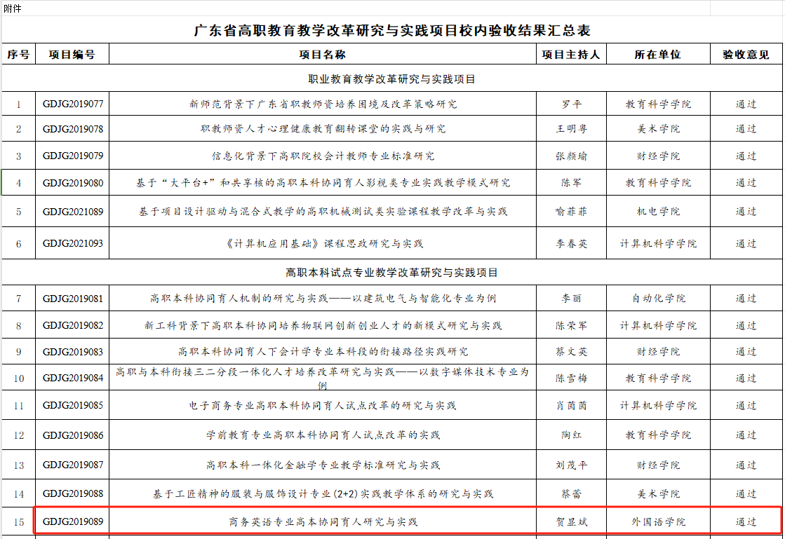 我院贺显斌老师负责的《商务英语专业高本协同育人研究与实践》获广东省高职教育教学改革研究与实践项目校内验收结果通过
