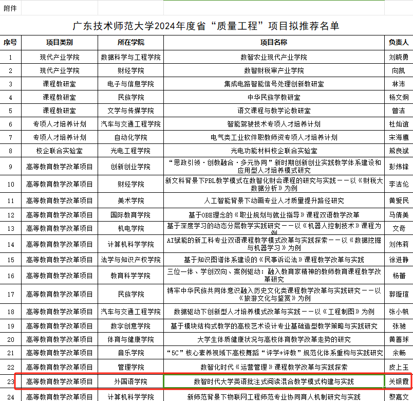 我院关银霞老师《数智化大学英语批注式阅读混合教学模式构建与实践》项目获2024年度省“质量工程”项目拟推荐