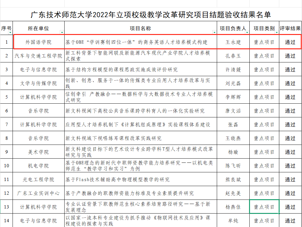 我院王永建老师负责的《基于OBE“学训赛创四位一体”的商务英语人才培养模式构建》、陈冬桂老师负责的《专业认证视域下英语(师范)人才培养模式的实践研究》、张彦琳老师负责的《以思维进阶式的问题设计训练提升英语师范生教学素养的探索与实践》、叶薇老师负责《课堂展示的形成性评价应用实践研究》、倪菲菲老师负责的《给养理论视阈下大学英语教师课程思政教学能力的提升路径探索》、王家明老师负责的《职前英语教师专业发展愿景的提升与实现》、邵朝杨老师负责的《基于混合式教学的<高级英语>课程思政研究》、李逸涵老师负责的《外语专业课程思政教学改革实践路径探索——以<跨文化商务交际导论>课程为例》、赵梁信子老师负责的《“干预-反应”模型在大学英语视听说课程混合教学模式中的应用研究》、邬海厅老师负责的《“文化自信”背景下日语笔译课程的思政探索》获Beat365官网2022年立项校级教学改革研究项目结题验收结果通过