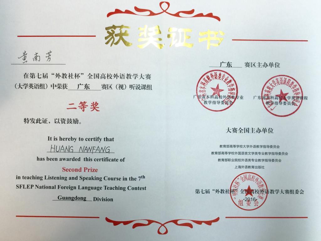 2016年第七届外教社杯全国高校外语教学大赛二等奖黄南芳老师